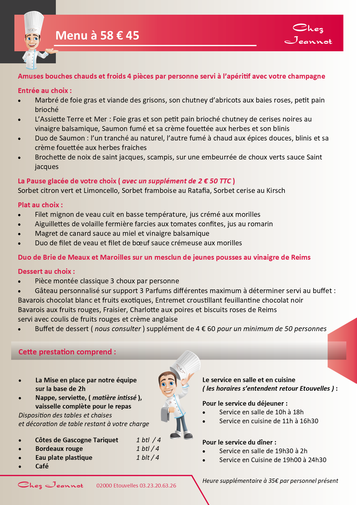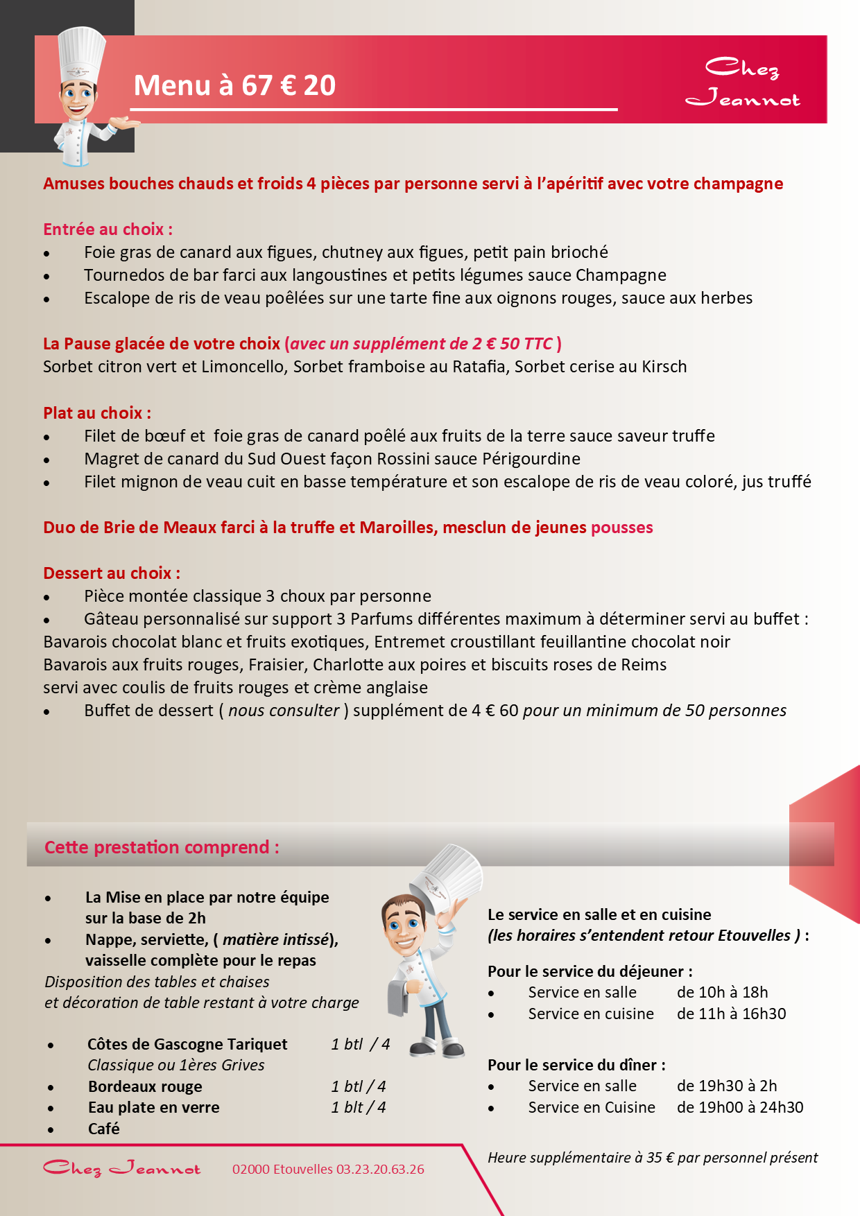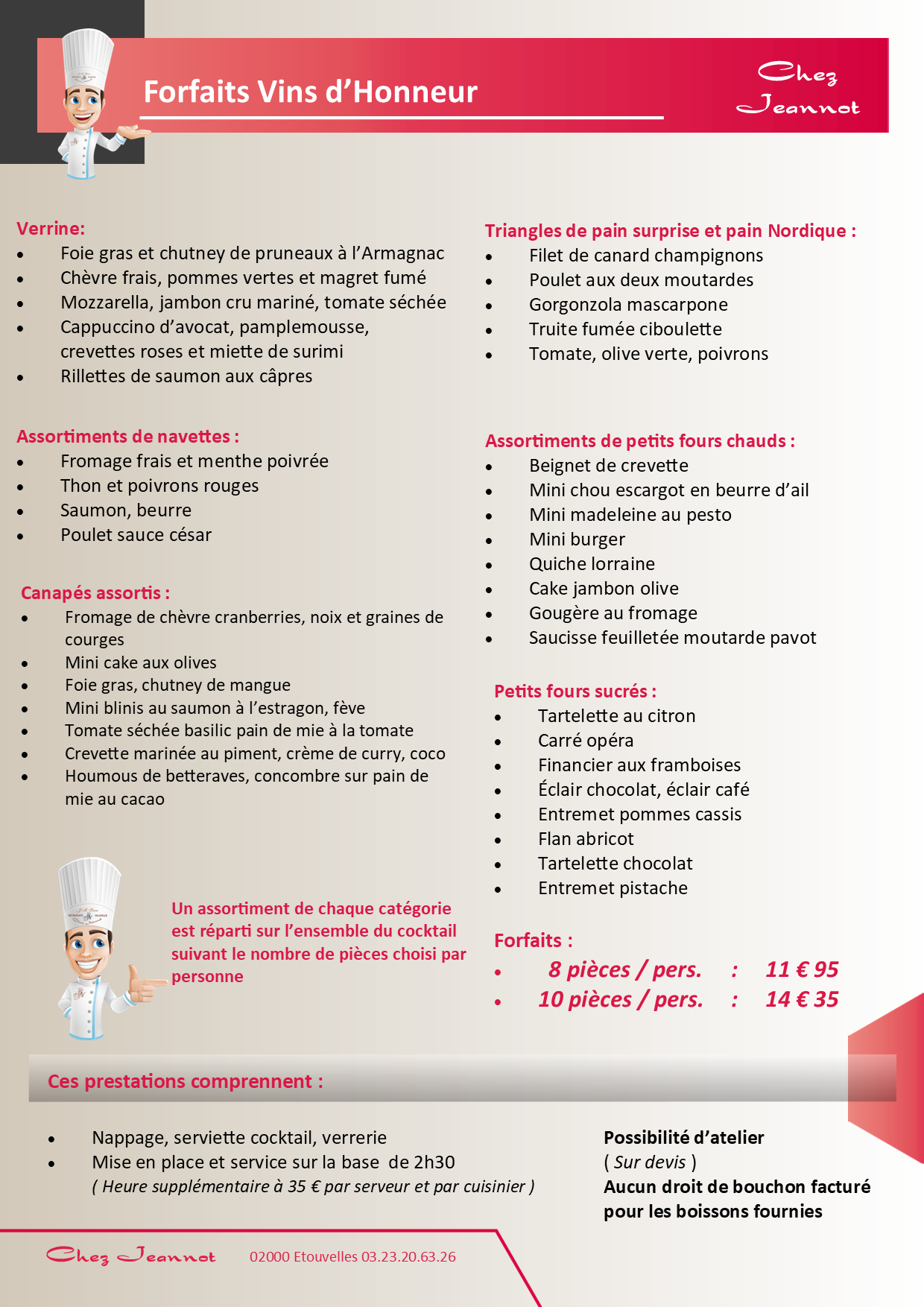 Notre service traiteur vous propose cinq menus et un forfait Vin d'Honneur pour vos événements : mariage, anniversaire, communion, baptême, etc.